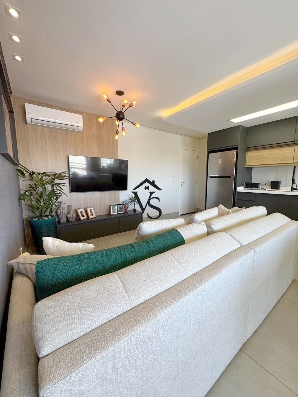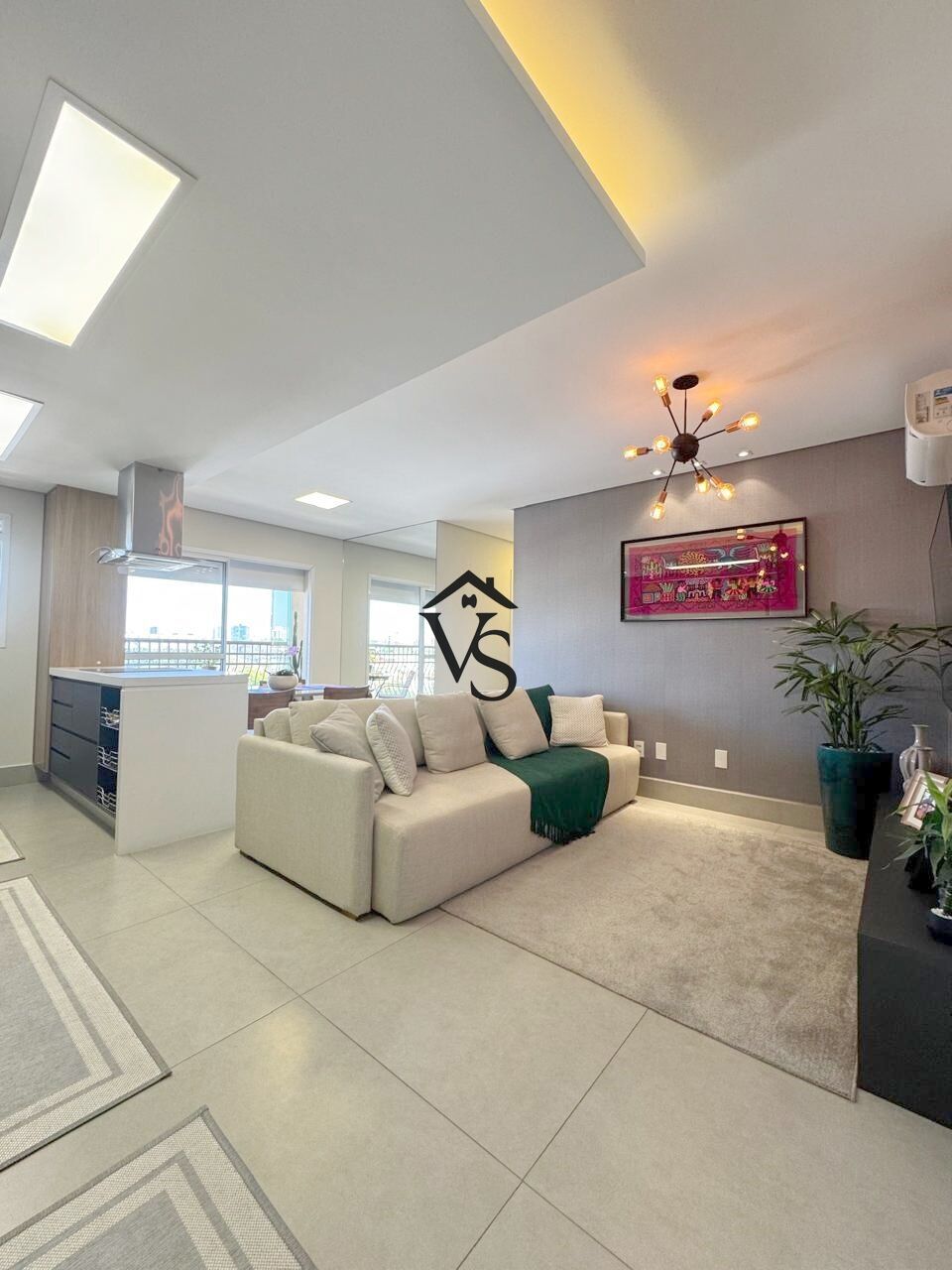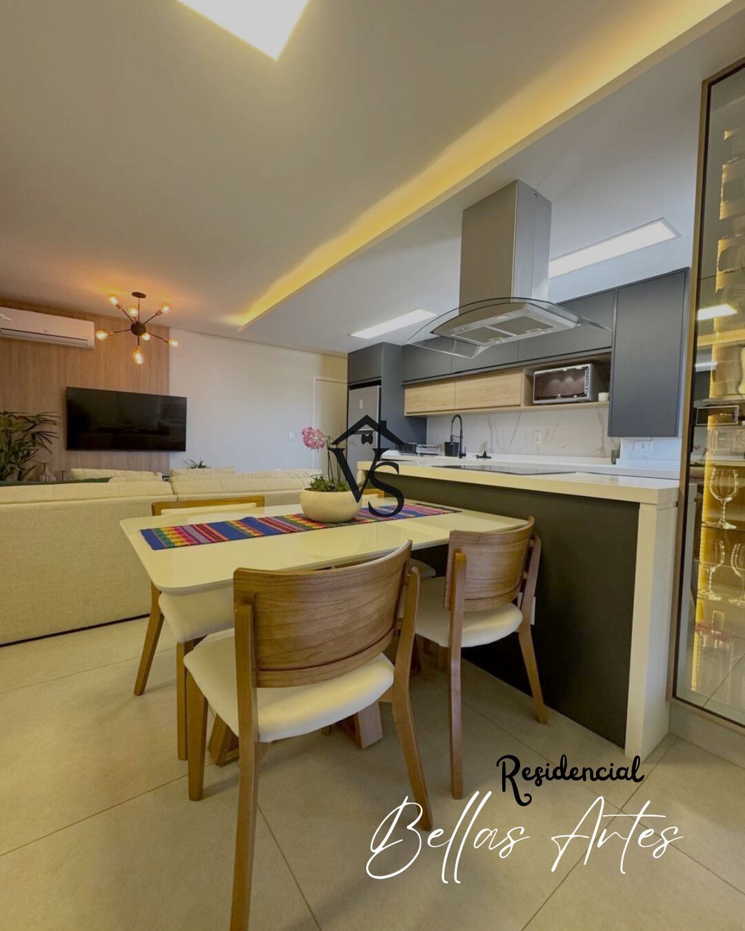 ampla sala integrada a cozinha ilha