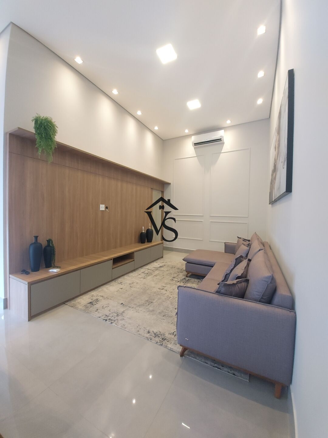 - sala de tv com painel e sofá