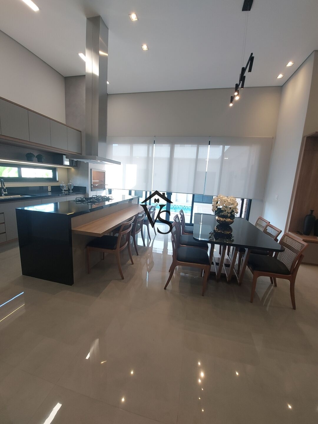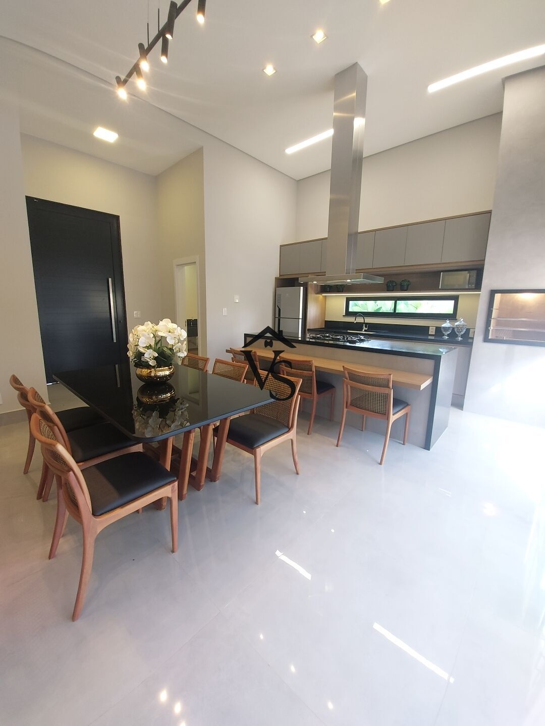 - cozinha gourmet com ilha, toda equipada com forno, fogao, geladeira e cadeiras
