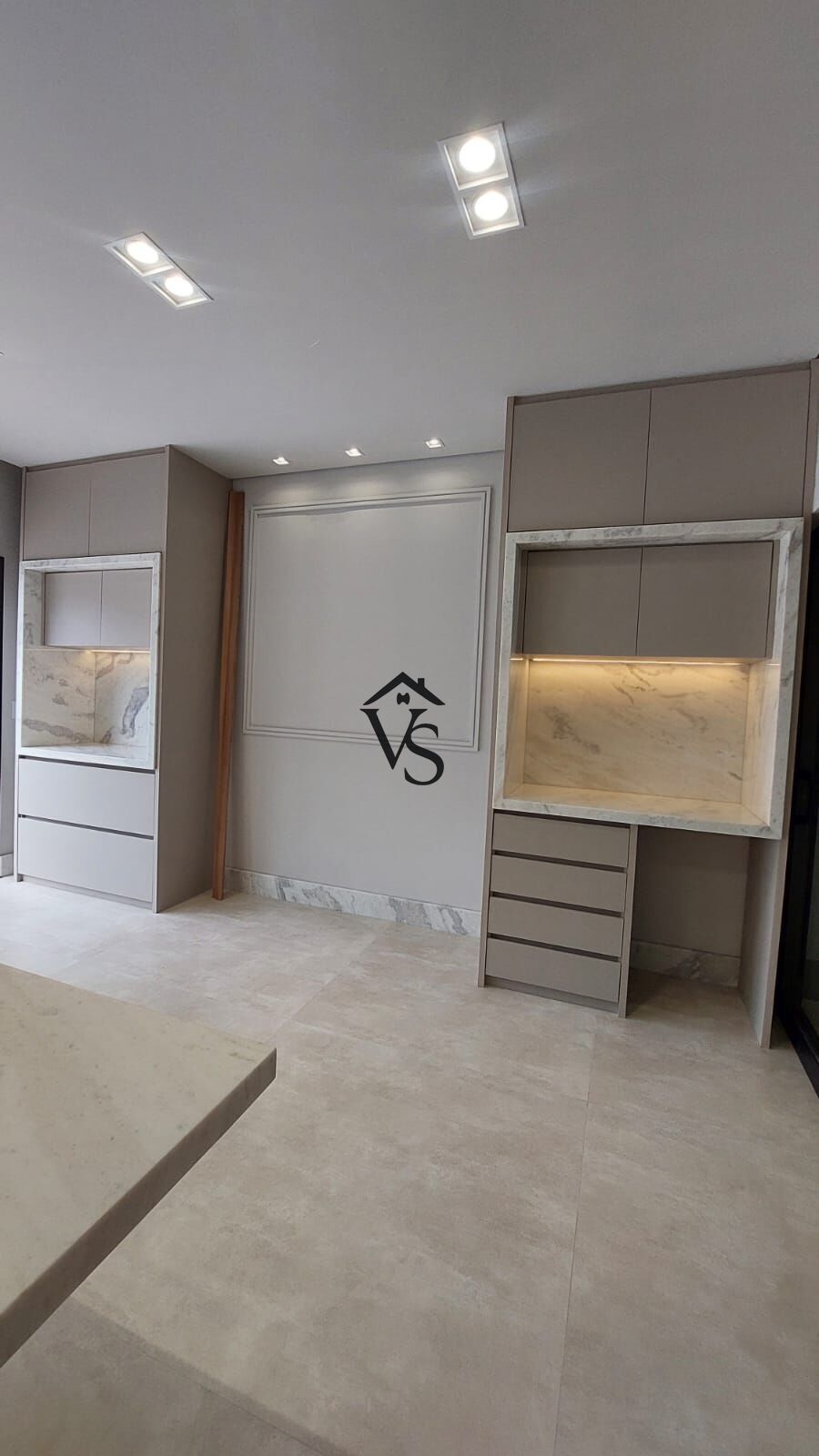 - sala de tv com painel e espelho