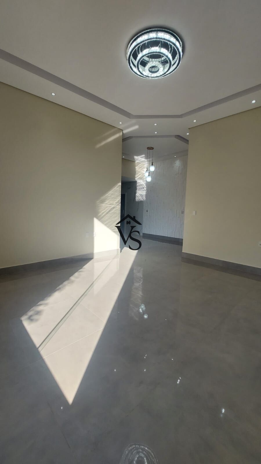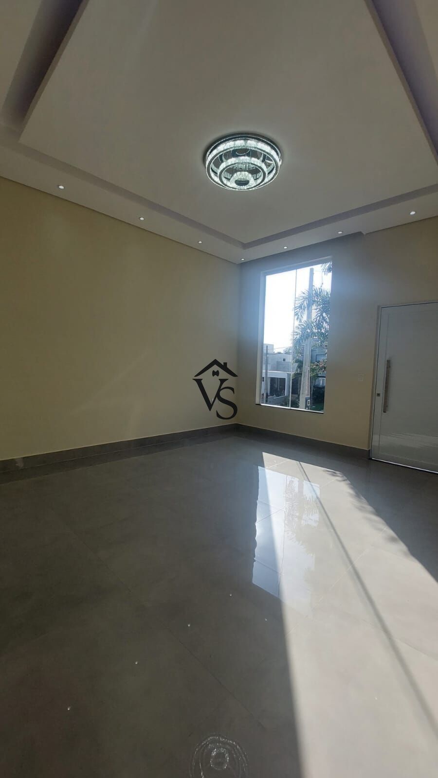 - sala de tv pé direito alto com sanca e um lindo lustre de cristais