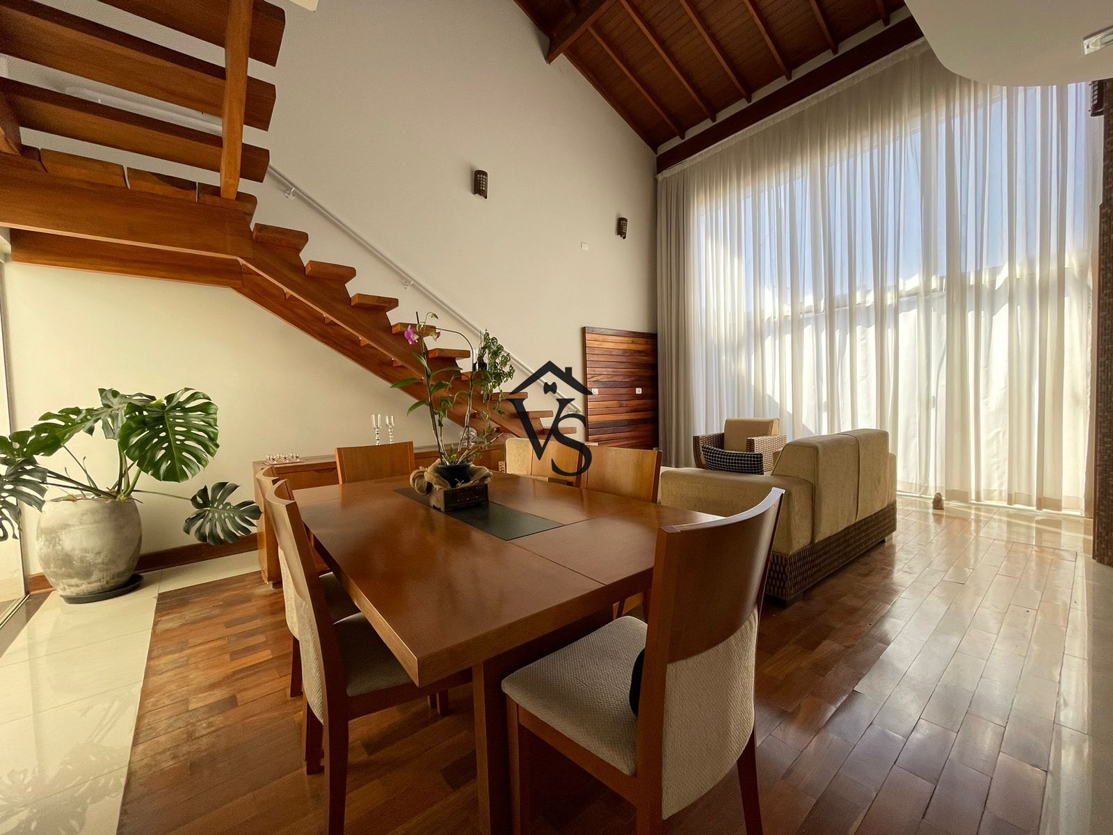 Casa térrea com mezanino com acabamento diferenciado evidenciando o uso abundante de madeira de lei nos ambientes. A harmonia proporcionada pela presença marcante da madeira eleva a atmosfera dos ambientes, criando um cenário acolhedor e elegante.